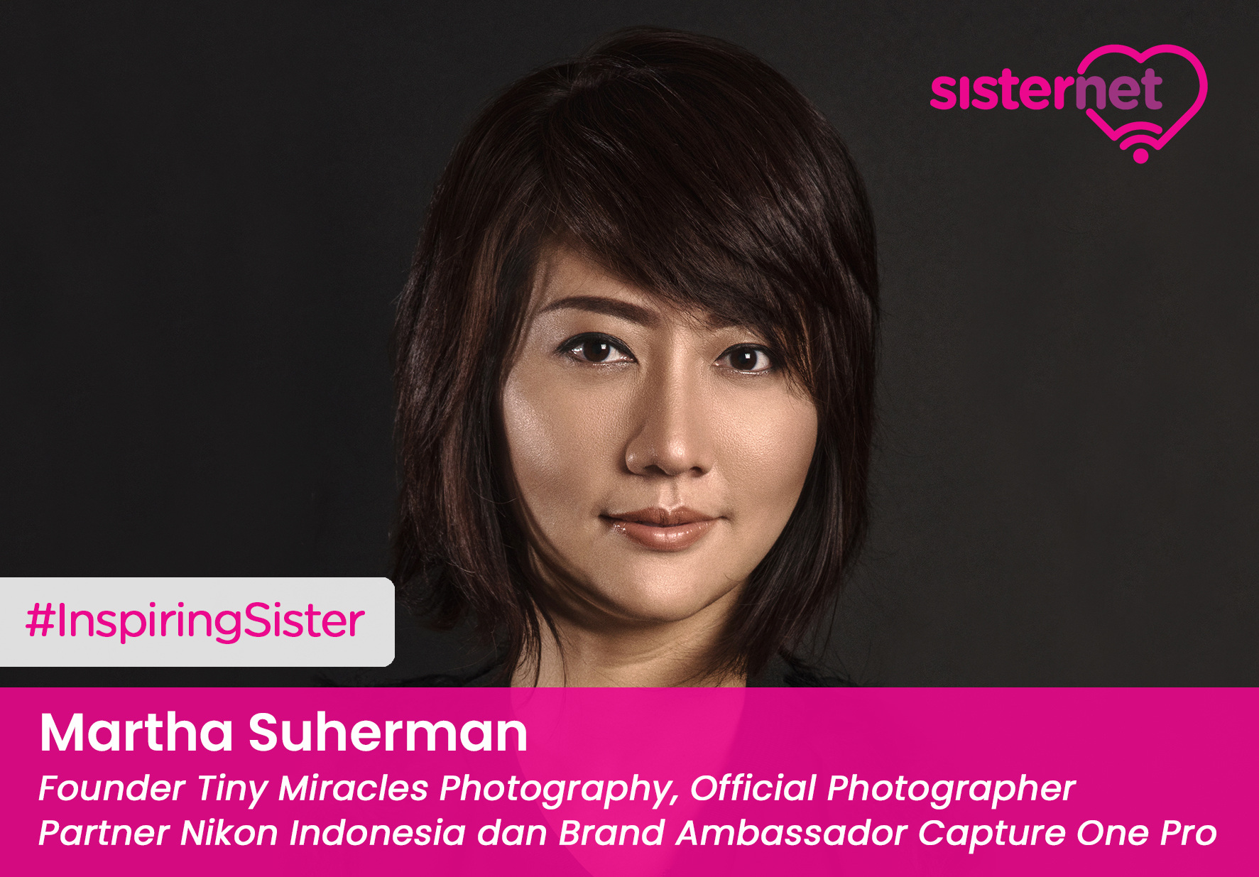 A: Saya, seorang ibu dengan dua anak, selama lebih dari 18 tahun menekuni fotografi, sejak tahun 2015 saya menjadi salah satu Official Photographer Partner dari Nikon Indonesia, kamera produksi Jepang yang saat ini brand kamera No. 2 di dunia dan juga tahun 2018 saya menjadi Brand Ambassador dari software Capture One Pro, dari Switzerland. Saya dari kecil sangat suka dengan seni, punya hobby menggambar dari kecil, maka saat kuliah saya menekuni jurusan Desain Komunikasi Visual di Universitas Trisakti Jakarta, memulai karir juga sebagai desainer grafis dan semakin mendalami ke seni visual yaitu Fotografi.